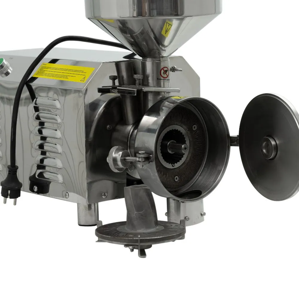 – это профессиональное оборудование для тонкого помола сухих сыпучих продуктов с влажностью не более 35%: пшеницы, ржи, кукурузы, гречки, риса, гороха, нута, сои, кофе, специй, сушёных ягод и других зерновых культур. Модель предназначена для использования на предприятиях пищевой промышленности, в пекарнях, ресторанах и цехах общественного питания. Мощный двигатель 2200 Вт и чугунные жернова обеспечивают производительность до 30–50 кг/ч, а получаемая мука соответствует всем стандартам качества и подходит для выпечки хлеба и хлебобулочных изделий. Корпус и приёмный бункер выполнены из нержавеющей стали с применением технологий хромирования и окрашивания, что гарантирует гигиеничность и долговечность даже при интенсивной эксплуатации.